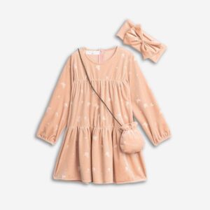FUNKY – Φόρεμα βελουτέ με πεταλούδες, τσάντα πουγκί και κορδέλα