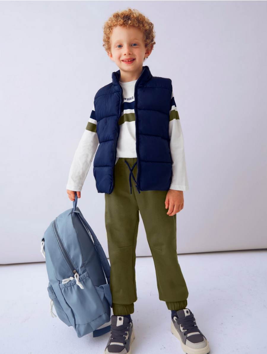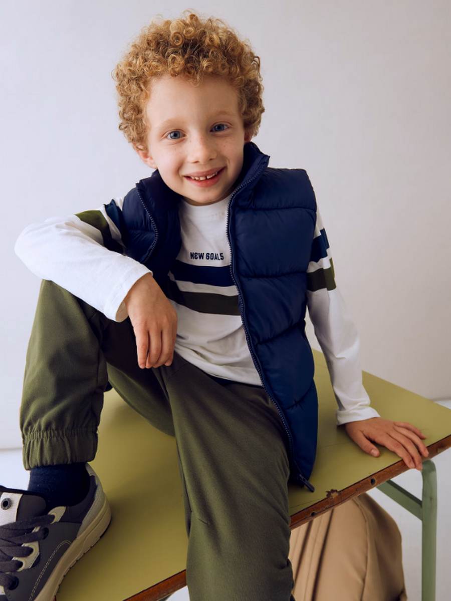 Γιλέκο για αγόρι. Γυριστός γιακάς. Κλείνει στο κέντρο μπροστά με φερμουάρ. Ύφασμα εξωτερικά με ενισχυμένο εφέ.