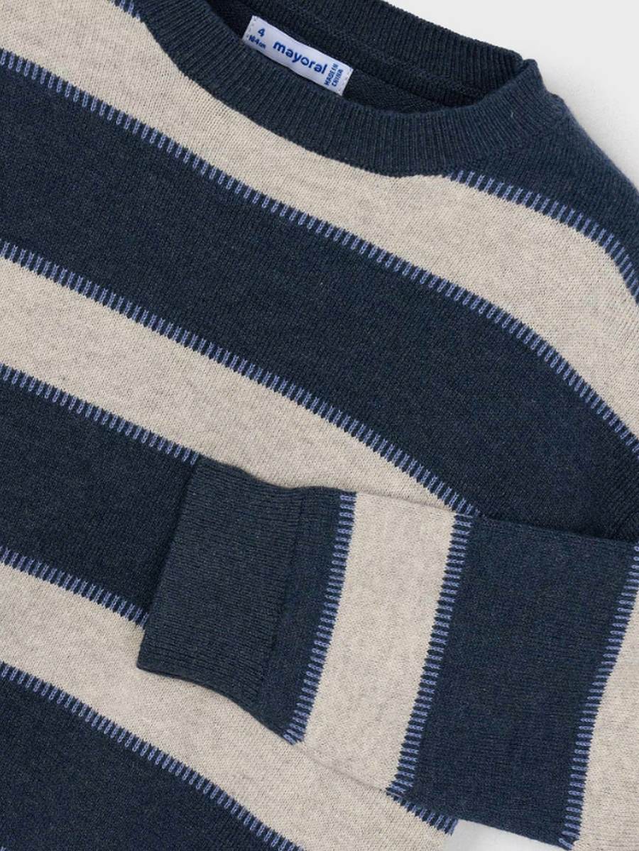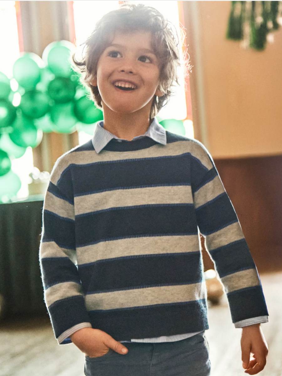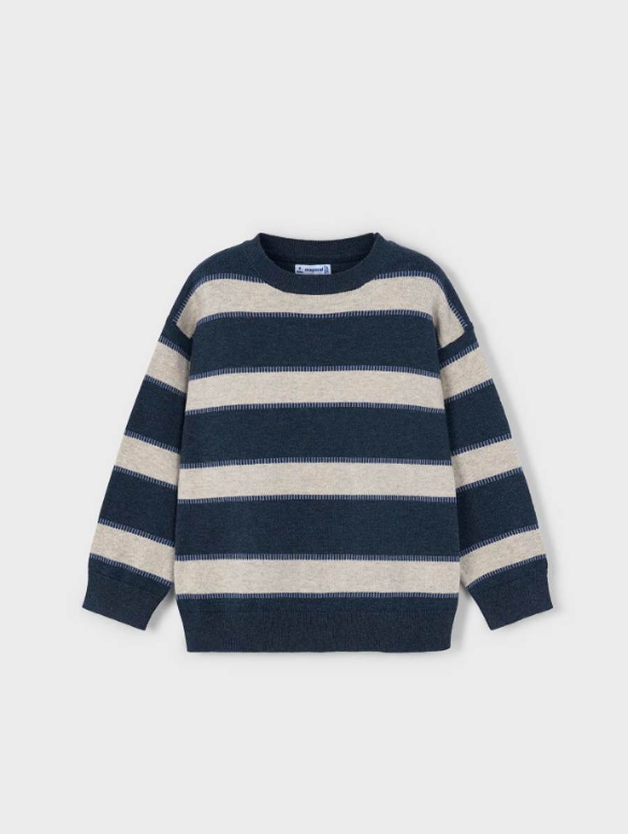 Περιέχει ανακυκλωμένο πολυαμίδιο. Ζέρσεϋ μακρυμάνικο για αγόρι. Στρογγυλεμένος γιακάς. Πλεκτό ύφασμα απαλό και ευχάριστο στην αφή. Σχέδιο ριγέ.